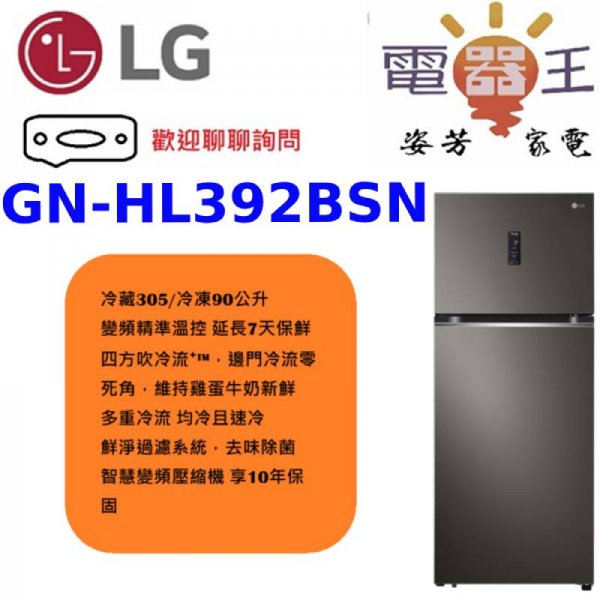 ✿加Line更優惠✿【GN-HL392BSN】LG 樂金 395L 智慧變頻雙門冰箱- 星