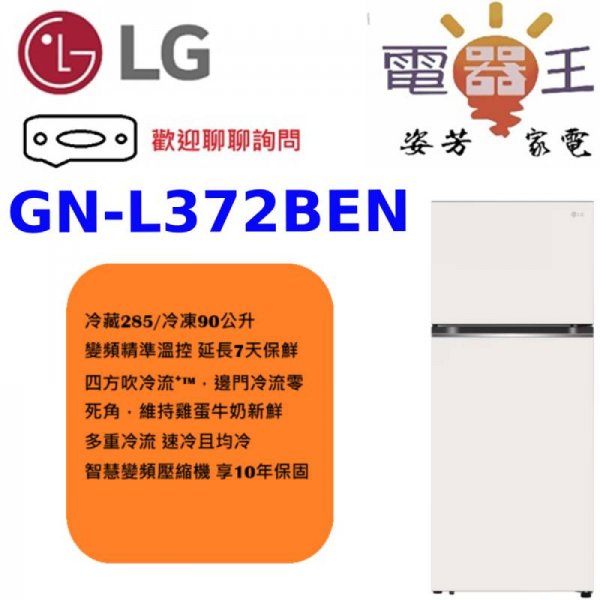 ✿加Line更優惠✿【GN-L372BEN】LG 樂金 375L 智慧變頻雙門冰箱-香草