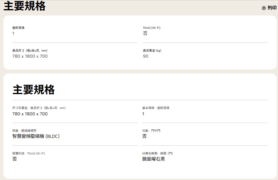 525L 鏡面曜石黑 冷藏389/冷凍136公升 產品尺寸(寬x高x深)780 x 1800 x 700 mm
