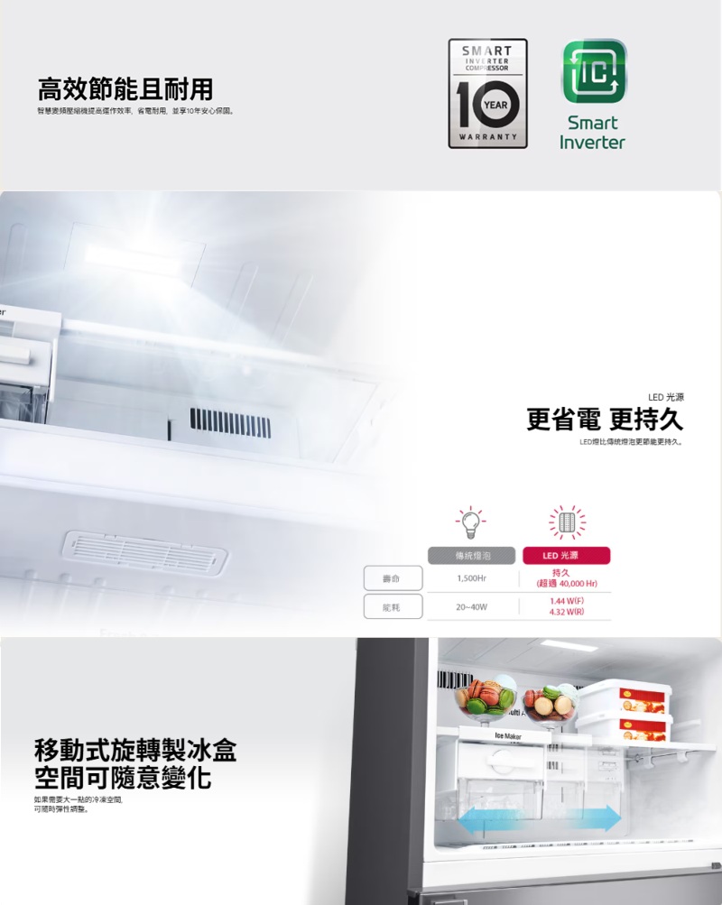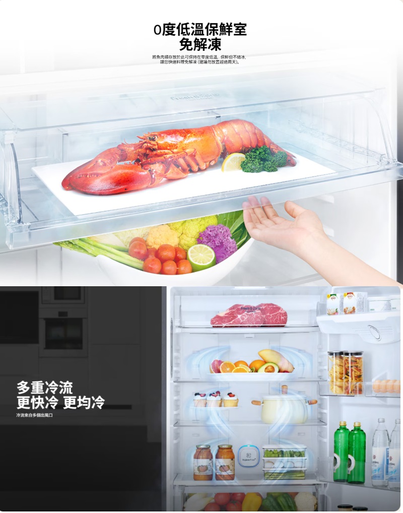 變頻壓縮機精準溫控,延長7天保鮮 >四方吹冷流+,邊門冷流零死角,維持雞蛋牛奶新鮮 >變頻壓縮機,更安靜更省電,享10年保固 >0度低溫保鮮室,快速料理免解凍 >鮮淨過濾系統,INTERTEK認證殺菌99.9%,有效去味除菌 | 多重冷流更均冷,維持食材新鮮
