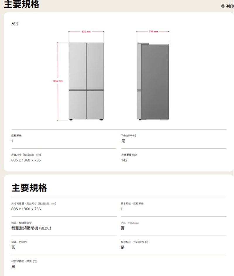 610L 曜石黑鏡面 冷凍176/冷藏443公升 產品尺寸(寬x高x深) 835 x 1860 x 736mm
