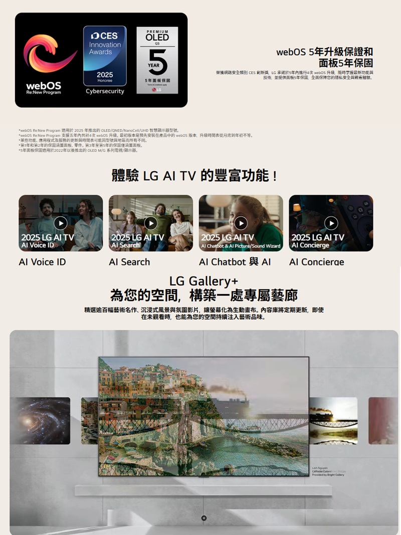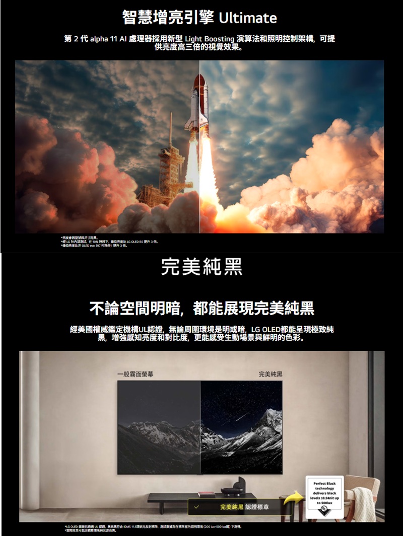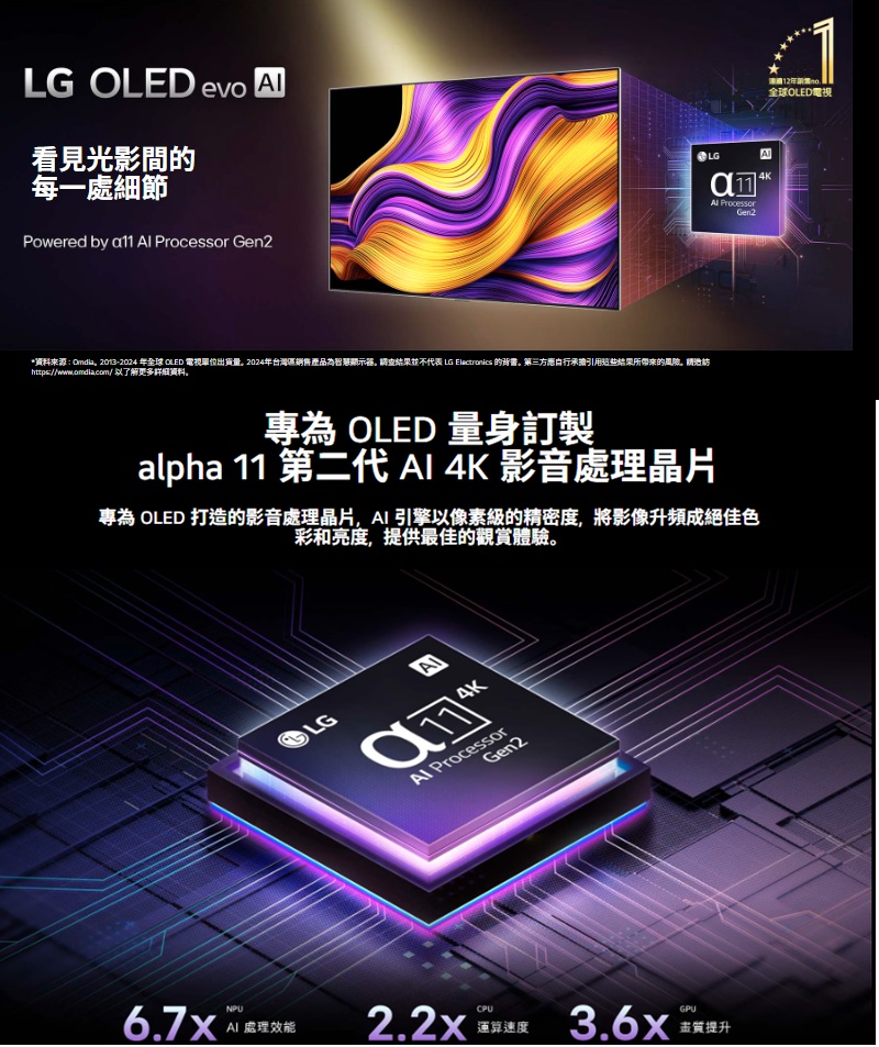 不只第一 更是唯一 | LG OLED 連續12年銷售 NO.1 & 多項創新技術唯一* alpha 11 第二代 AI 4K 影音處理晶片 | AI 運算效能提升6.7倍,卓越體驗前所未見 >LG OLED evo 自體發光科技+智慧增亮引擎Ultimate 峰值亮度提升300% | 營造驚人對比、深度和細節 >如畫作般零間隙平貼於牆面,業界唯一好評推薦 >webOS 5年升級保證 + 面板5年保固 | 國際護眼認證:低藍光、不閃爍、無不適眩光 >支援杜比視界及全景聲 (Dolby Visio