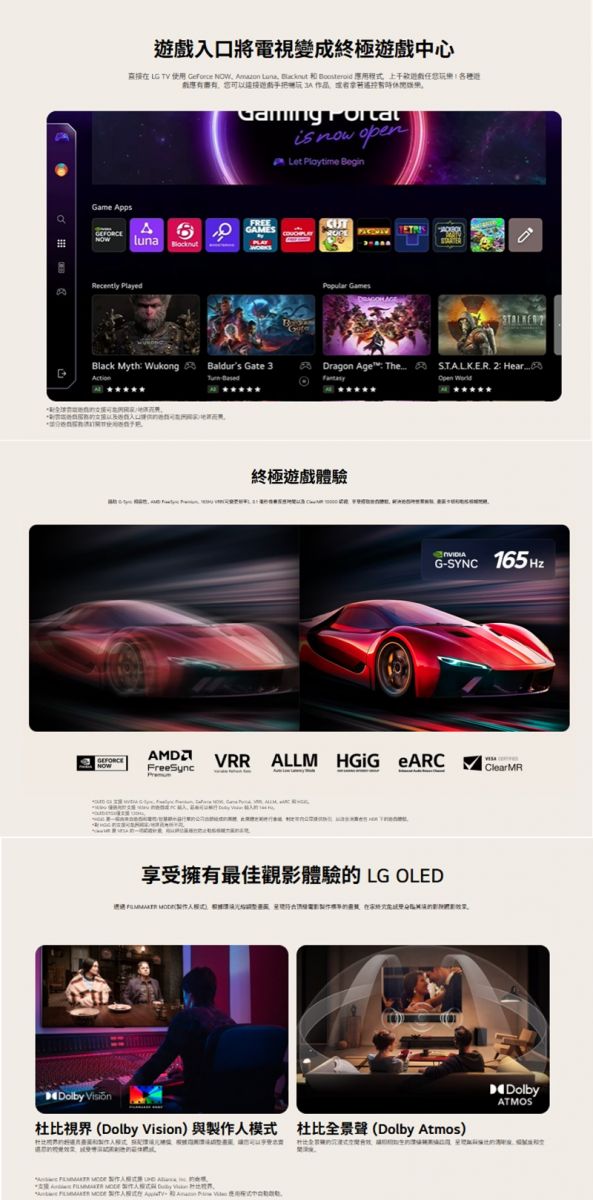 畫質(顯示) - 面板類型:4K OLED 畫質(顯示) - 螢幕更新率:原生120Hz (VRR 165Hz) 電視尺寸不含底座 (WxHxD):1441 x 826 x 24.3mm