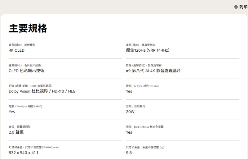 42吋 畫質(顯示) - 面板類型:4K OLED 畫質(顯示) - 螢幕更新率:原生120Hz (VRR 144Hz) 尺寸不含底座 (WxHxD):932 x 540 x 41.1mm