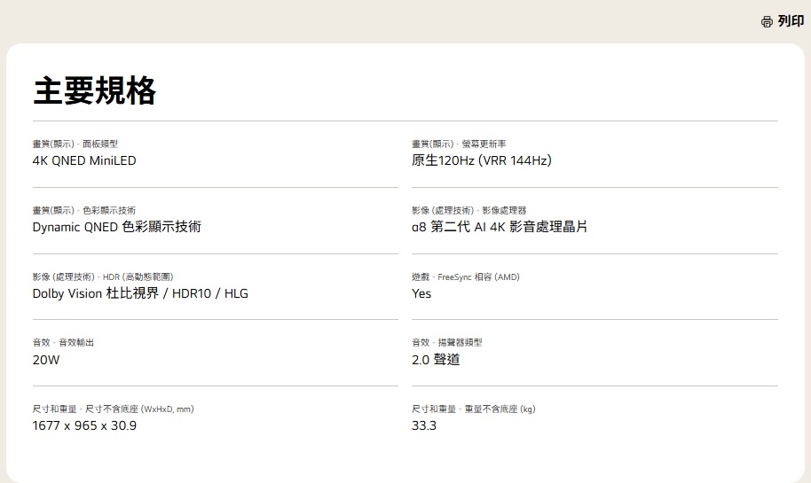 75吋 畫質(顯示) - 面板類型:4K QNED MiniLED 畫質(顯示) - 螢幕更新率:原生120Hz (VRR 144Hz) 尺寸不含底座 (WxHxD):1677 x 965 x 30.9 mm