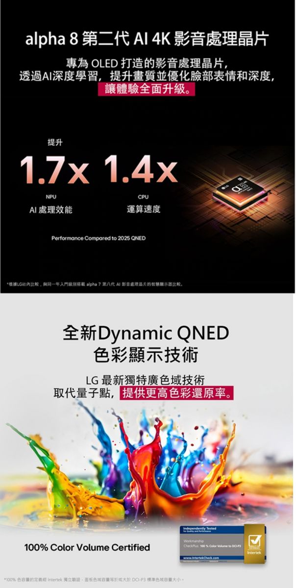 全新動態 QNED Color | 提供更豐富飽滿的色彩表現 alpha 8 第二代 AI 4K 影音處理晶片 | 呈現更清晰的畫質及音效,將觀影體驗提升至全新境界 >區域控光技術 | 畫面色彩準確、減少光暈,呈現最細膩的細節 >超纖薄設計完美融入您的居家空間 >全新AI智慧滑鼠遙控器 | 透過AI 搜尋、聲紋辨識、語音控制更便利 >webOS 5年升級保證 | 持續升級人性化操作