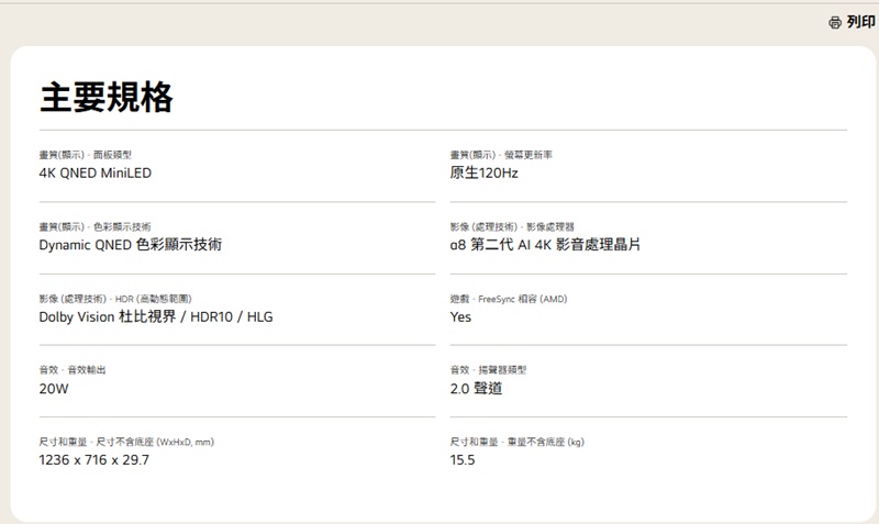 55吋 畫質(顯示) - 面板類型:4K QNED MiniLED 畫質(顯示) - 螢幕更新率:原生120Hz 尺寸不含底座 (WxHxD):1236 x 716 x 29.7 mm