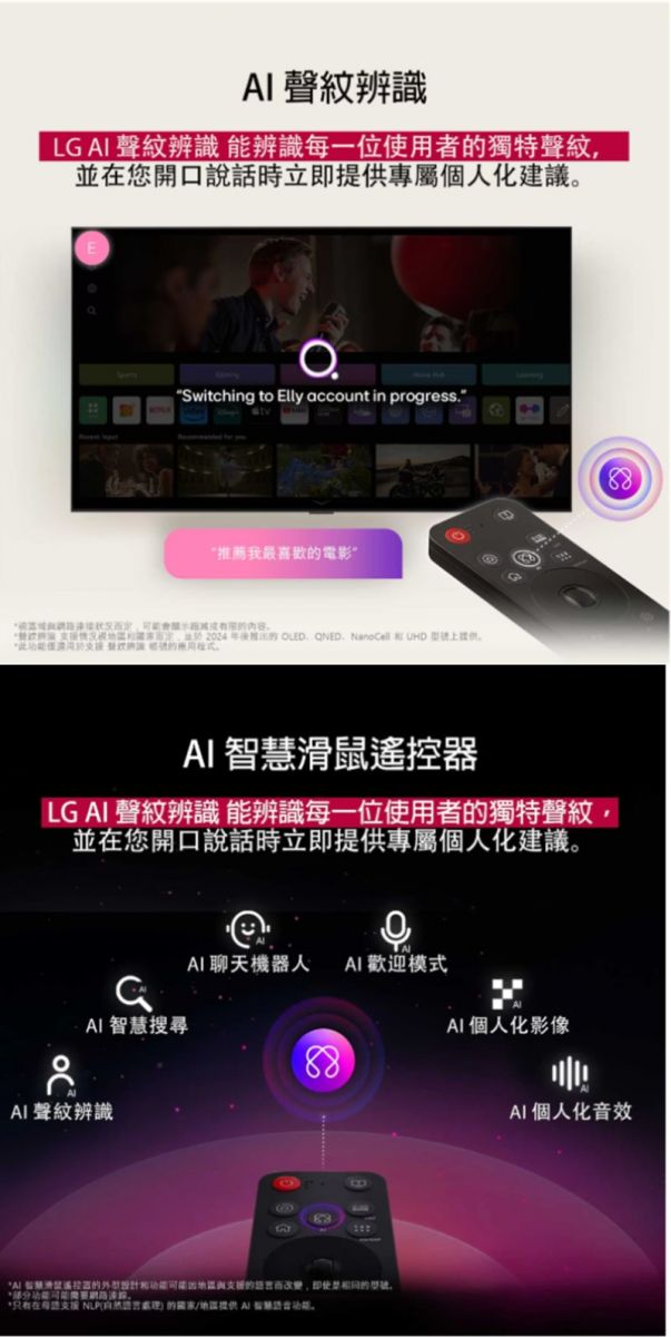>全新動態 QNED Color | 提供更豐富飽滿的色彩表現 >alpha 8 第二代 AI 4K 影音處理晶片 | 呈現更清晰的畫質及音效,將觀影體驗提升至全新境界 >區域控光技術 | 畫面色彩準確、減少光暈,呈現最細膩的細節 >超纖薄設計完美融入您的居家空間 >全新AI智慧滑鼠遙控器 | 透過AI 搜尋、聲紋辨識、語音控制更便利 >webOS 5年升級保證 | 持續升級人性化操作