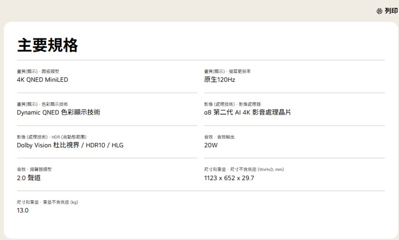 50吋 畫質(顯示) - 面板類型:4K QNED MiniLED 畫質(顯示) - 螢幕更新率:原生120Hz 尺寸不含底座 (WxHxD):1123 x 652 x 29.7 mm