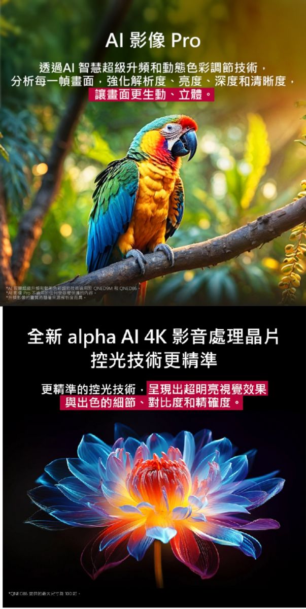 >全新動態 QNED Color | 提供更豐富飽滿的色彩表現 >alpha 8 第二代 AI 4K 影音處理晶片 | 呈現更清晰的畫質及音效,將觀影體驗提升至全新境界 >區域控光技術 | 畫面色彩準確、減少光暈,呈現最細膩的細節 >超纖薄設計完美融入您的居家空間 >全新AI智慧滑鼠遙控器 | 透過AI 搜尋、聲紋辨識、語音控制更便利 >webOS 5年升級保證 | 持續升級人性化操作