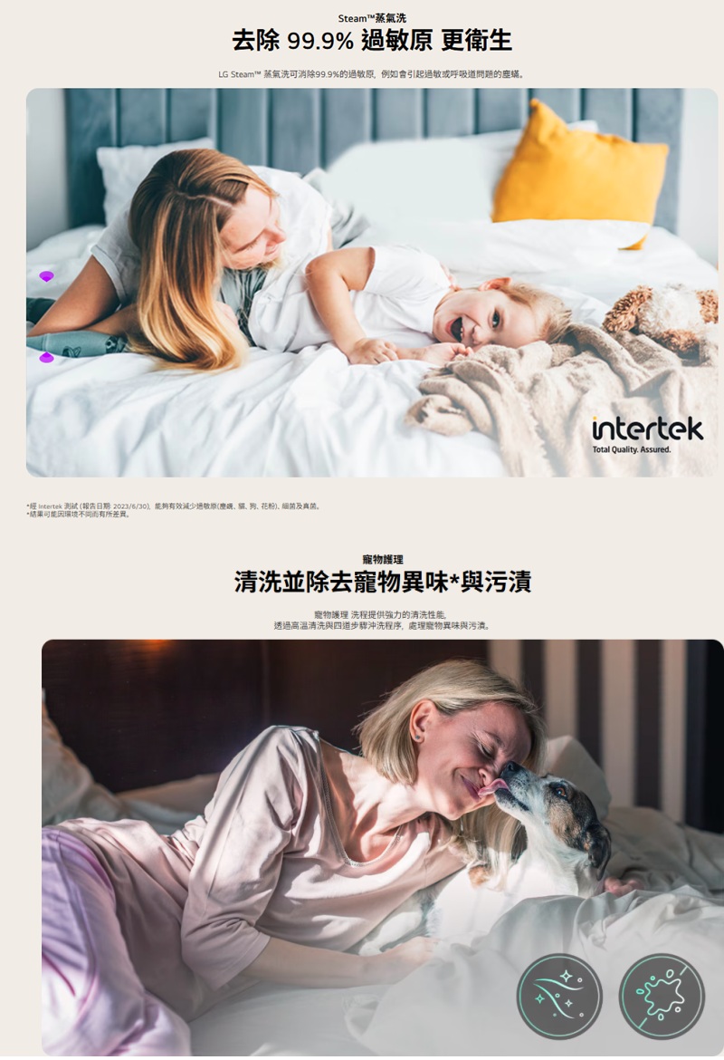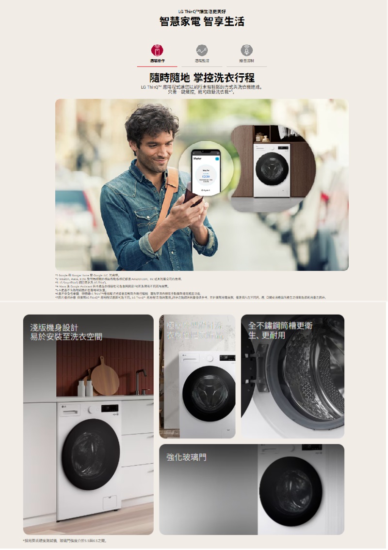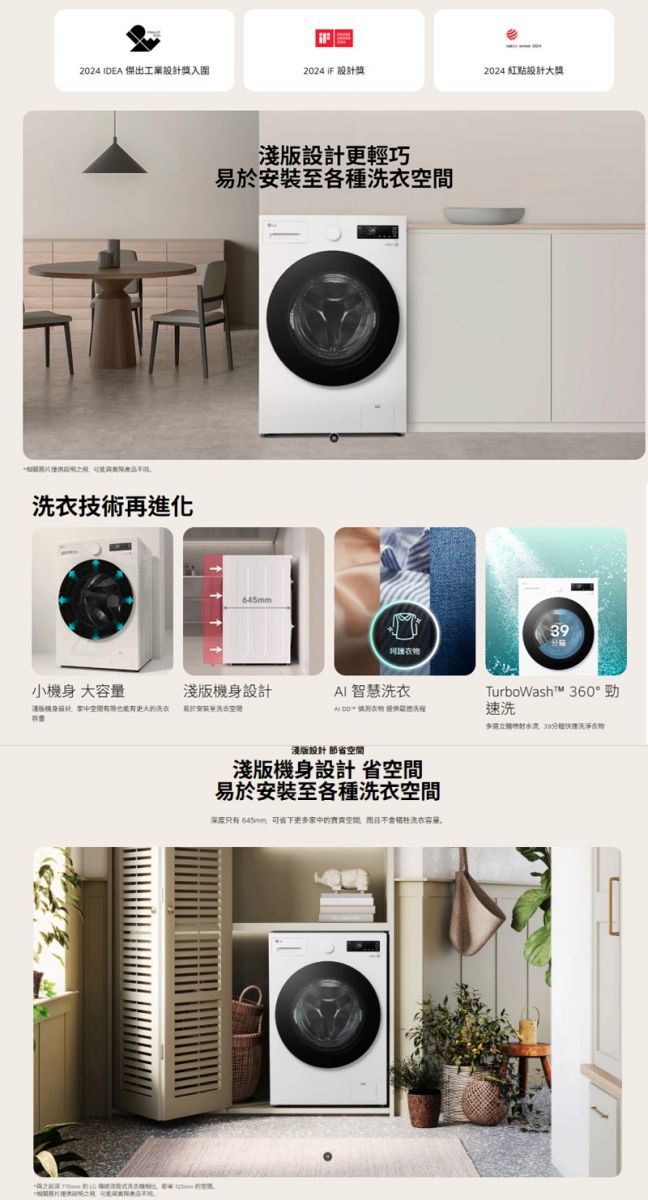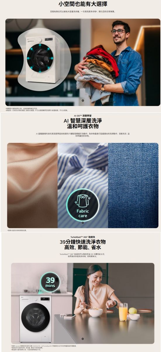 >淺版好安裝 小空間也有大選擇 >AI DD™ 智慧直驅變頻馬達:AI 智慧感測 提供最適洗程 >Steam™蒸氣洗:60°C天然蒸氣去除99.9%過敏原 >TurboWash™ 360°勁速洗 39分鐘快速洗淨衣物 6 Motion 智慧模擬手洗:深層洗淨 溫和呵護衣物 直驅變頻馬達10年保固 更安靜、更耐用