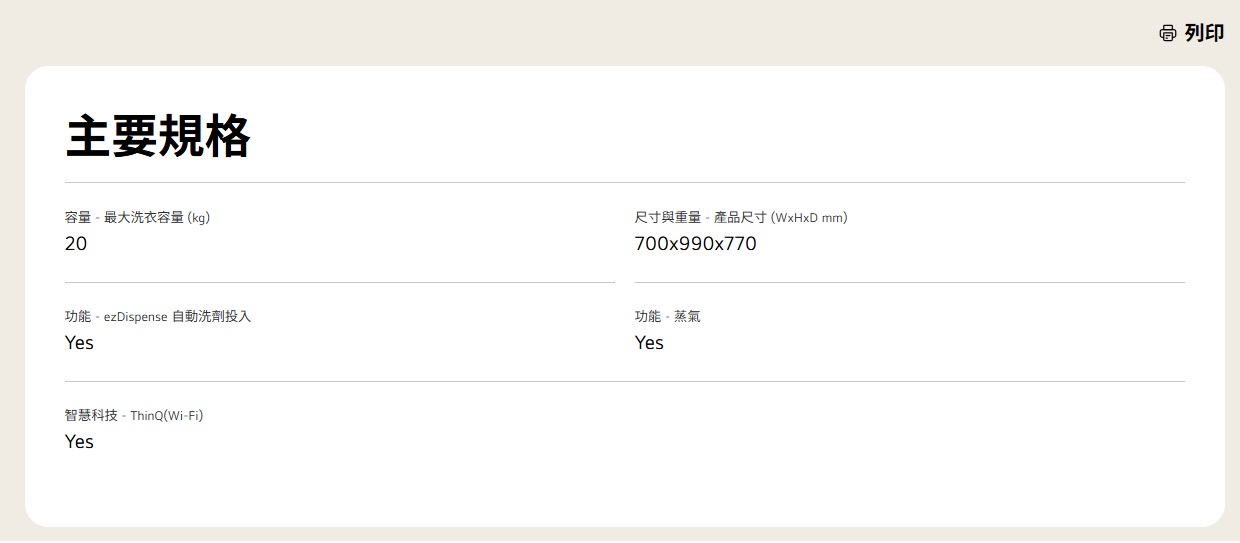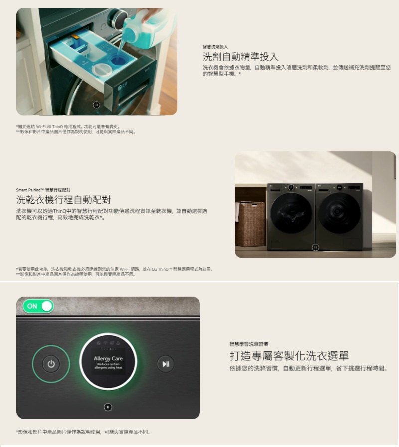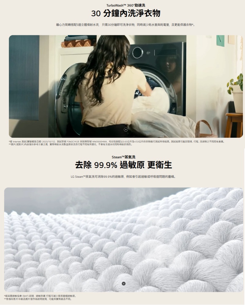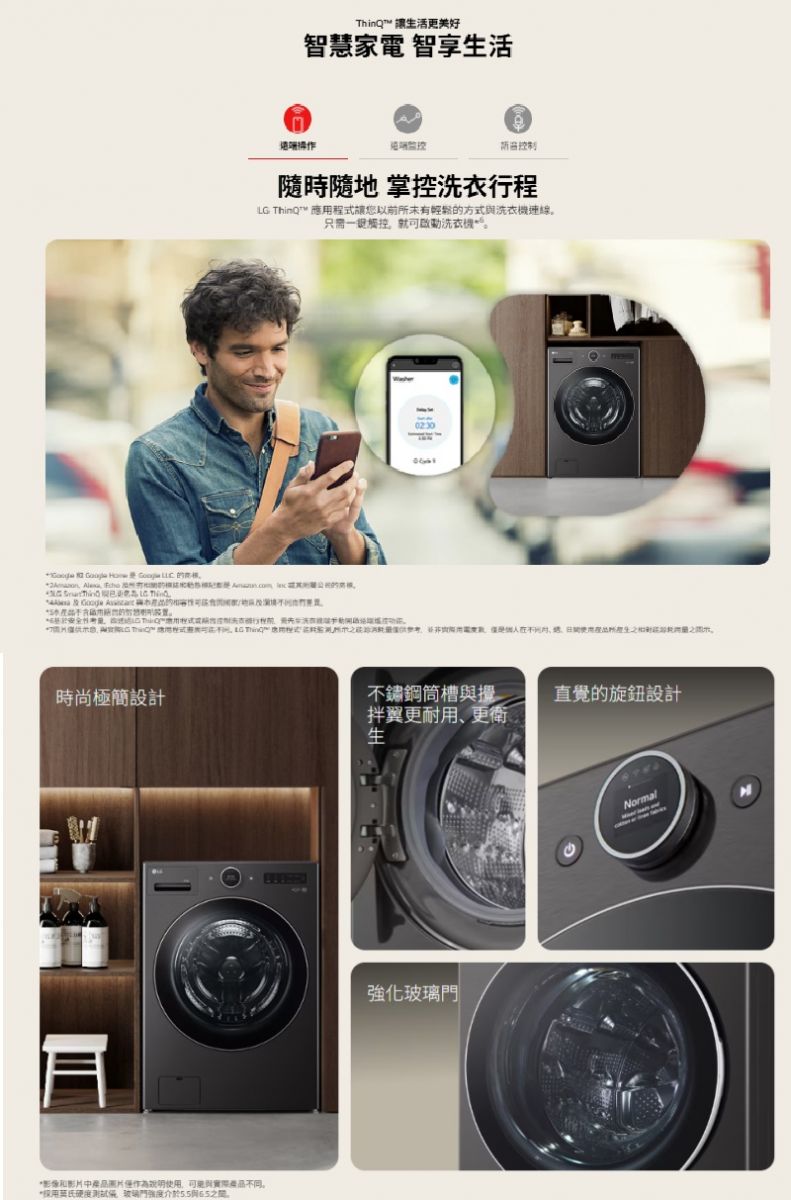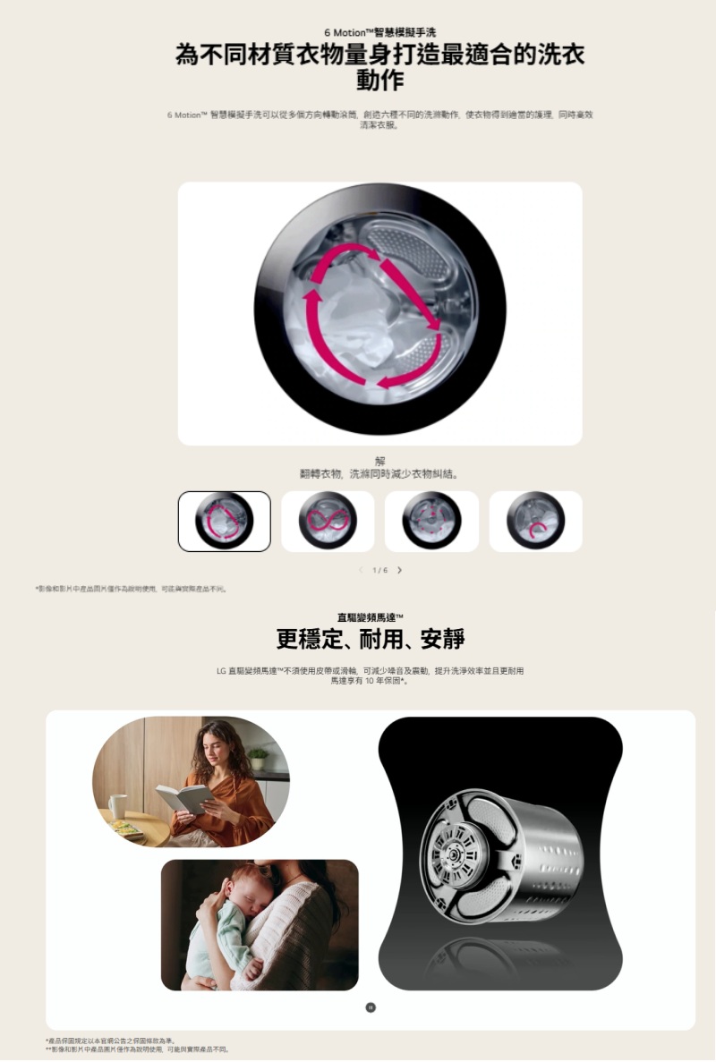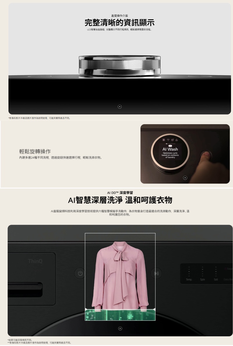 AI DD™ 智慧直驅變頻馬達:AI 智慧感測 提供最適洗程 LCD智慧顯示旋鈕:使用更直覺、內建24種行程 >智慧洗劑投入:自動精準投入 x 密封保存不變質 >Steam™蒸氣洗:60°C天然蒸氣去除99.9%過敏原 >6 Motion 智慧模擬手洗:深層洗淨 溫和呵護衣物 >直驅變頻馬達安靜耐用,10年保固,榮獲節能標章