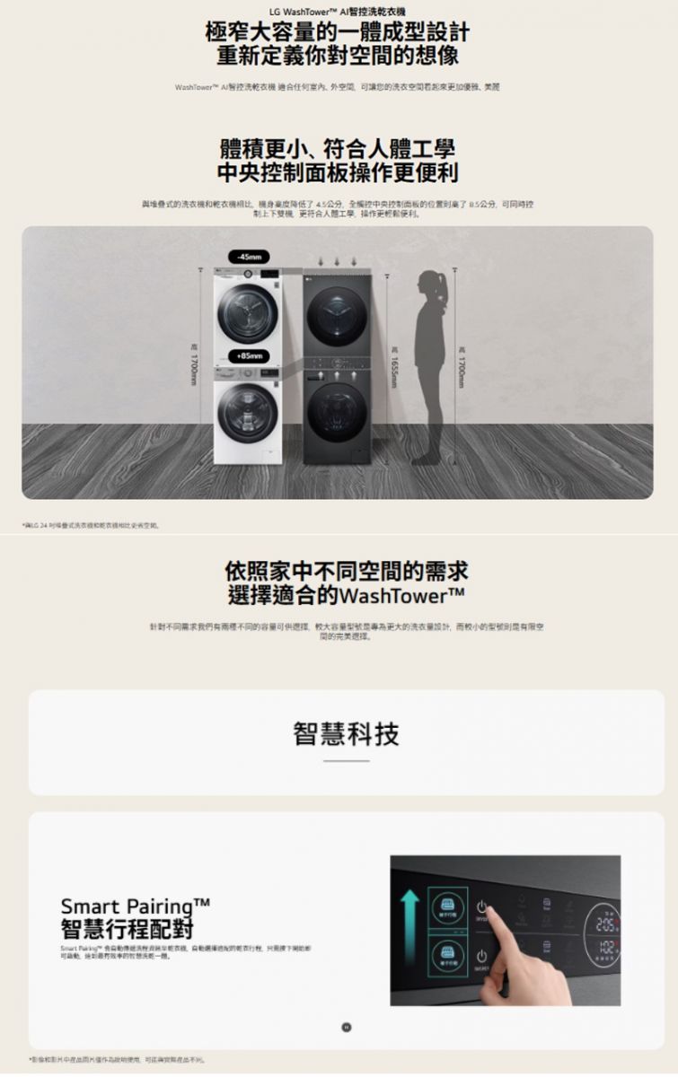 極窄大容量的垂直流線式一體成型設計 全觸控中央控制面板 上下雙機輕鬆同時操控 >AI DD™人工智慧智選最適洗衣行程 >Smart Pairing™ 智慧行程配對 洗乾衣行程傳輸配對 >TurboWash™ 360° 勁速洗 /乾衣預熱準備 >洗衣機:AI DD ™直驅變頻馬達/乾衣機:雙迴轉變頻壓縮機、變頻馬達 皆10年保固