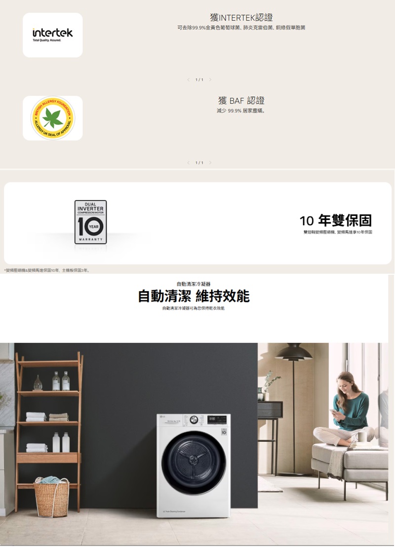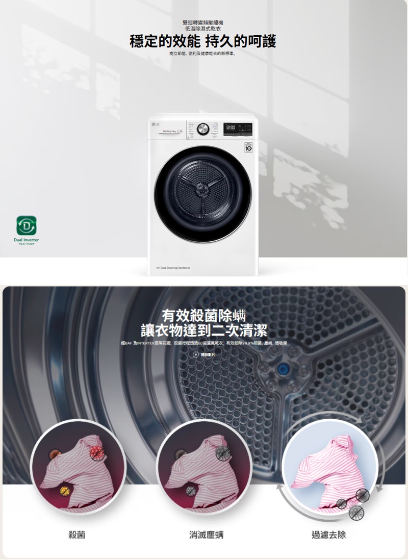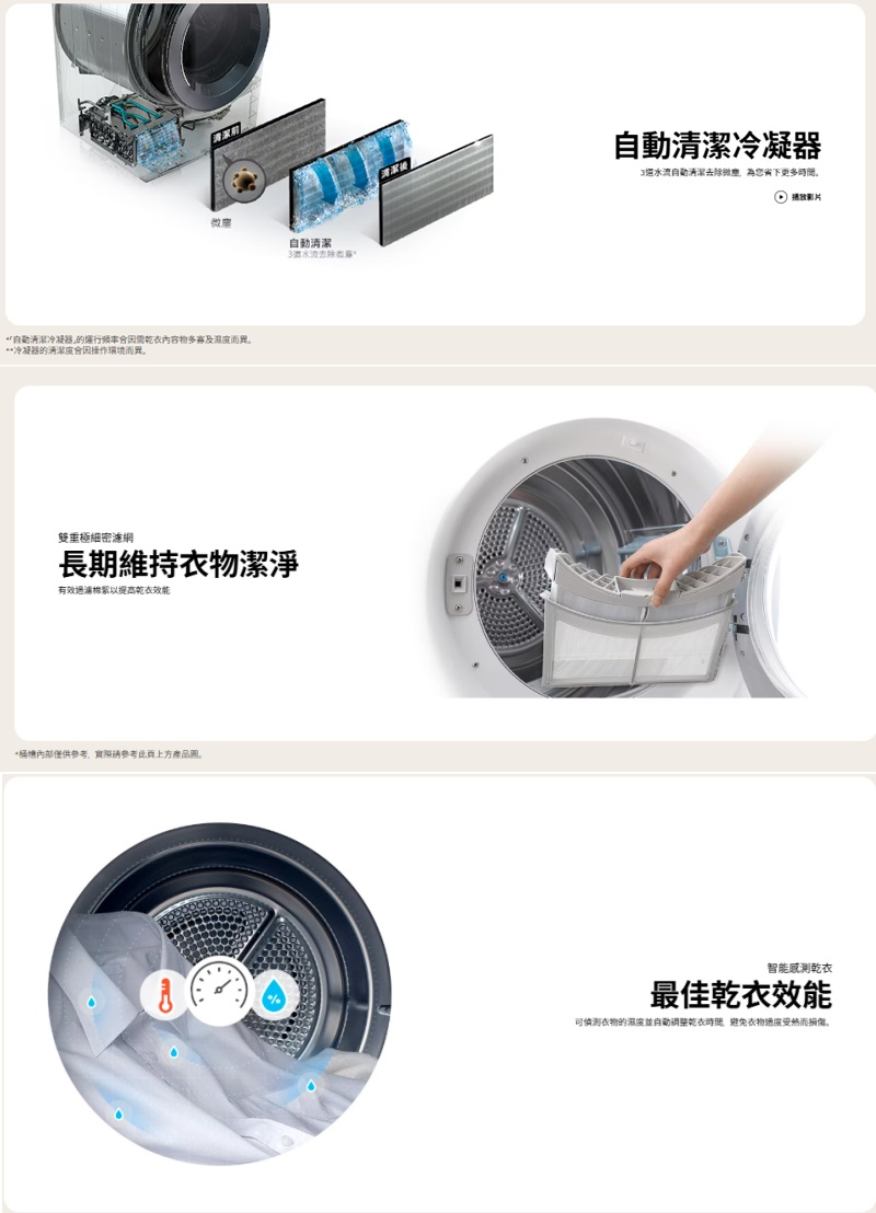 >更護衣,溫和除濕式乾衣 >更健康,60度殺菌行程 >更安全,110V隨插即用,免接瓦斯、排風管、免明火 >更淨化,雙重極細密濾網,濾除棉絮毛髮 >更耐用,自動/手動冷凝器雙重清潔、筒槽清潔、強化玻璃門 >內建WIFI,支援滾筒洗衣機智慧行程配對