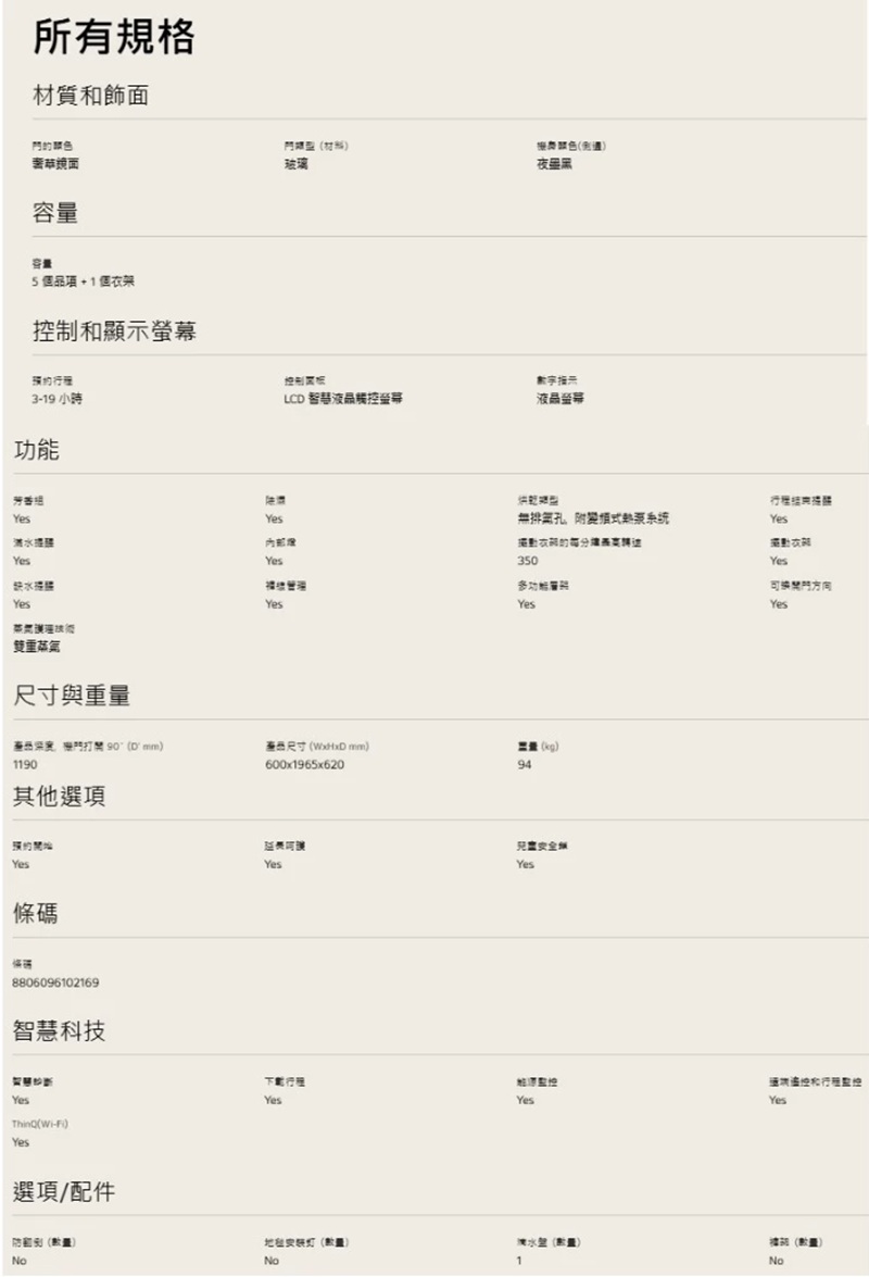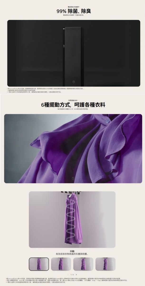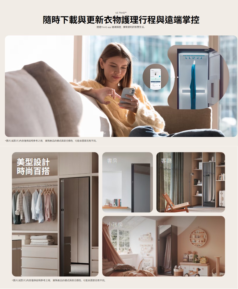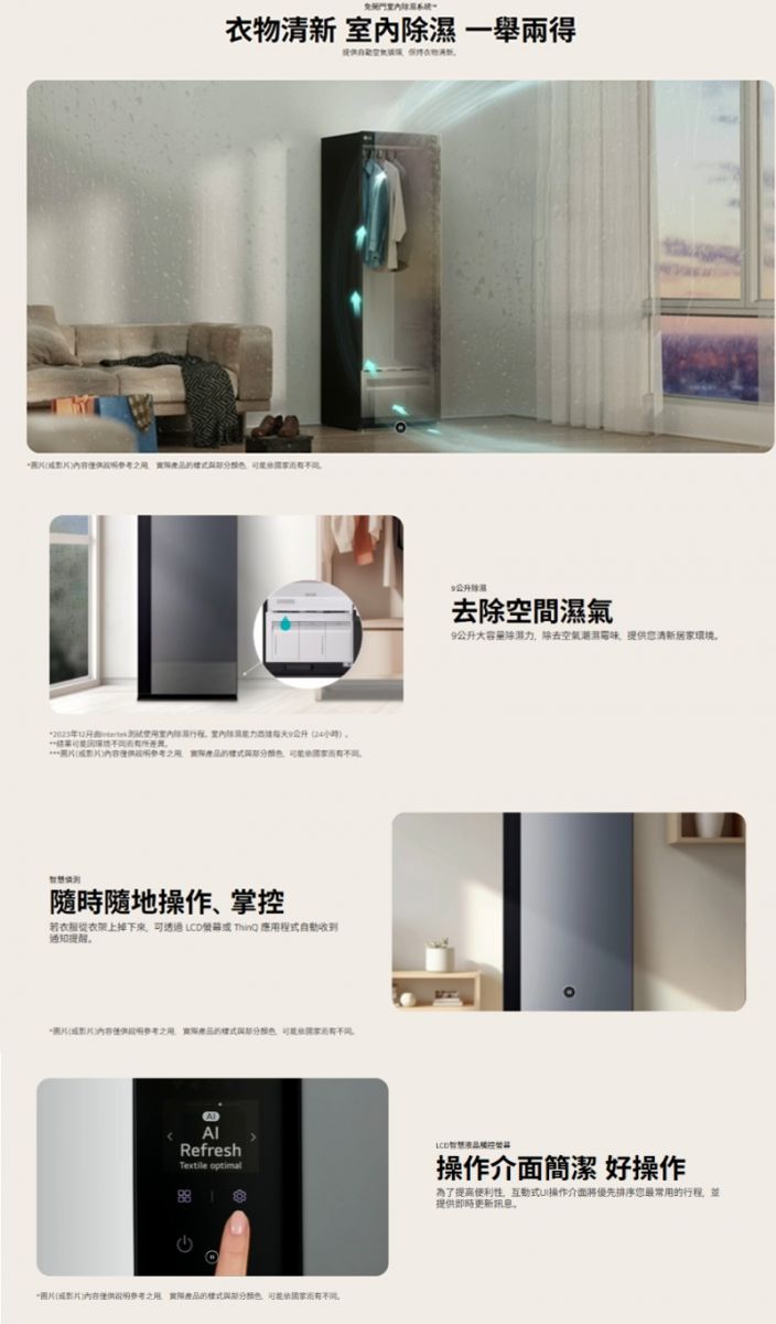 >AI 偵測:智慧擺動衣架 抖落灰塵同時呵護各種衣料 >強效整燙:內建高壓蒸氣掛燙機™ 快速平整 >操作簡易:LCD智慧液晶觸控螢幕 介面便利 >性能提升:雙重蒸氣衣物護理™ + 雙迴轉變頻壓縮機 >折疊式褲線管理器:恢復挺直褲線不費力 >優化除濕:免開門室內除濕系統 日除濕量9公升