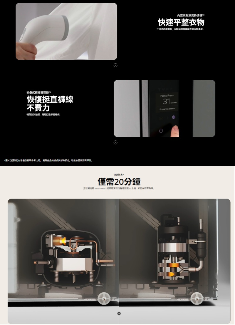 >AI 偵測:智慧擺動衣架 抖落灰塵同時呵護各種衣料 >強效整燙:內建高壓蒸氣掛燙機™ 快速平整 >操作簡易:LCD智慧液晶觸控螢幕 介面便利 >性能提升:雙重蒸氣衣物護理™ + 雙迴轉變頻壓縮機 >折疊式褲線管理器:恢復挺直褲線不費力 >優化除濕:免開門室內除濕系統 日除濕量9公升