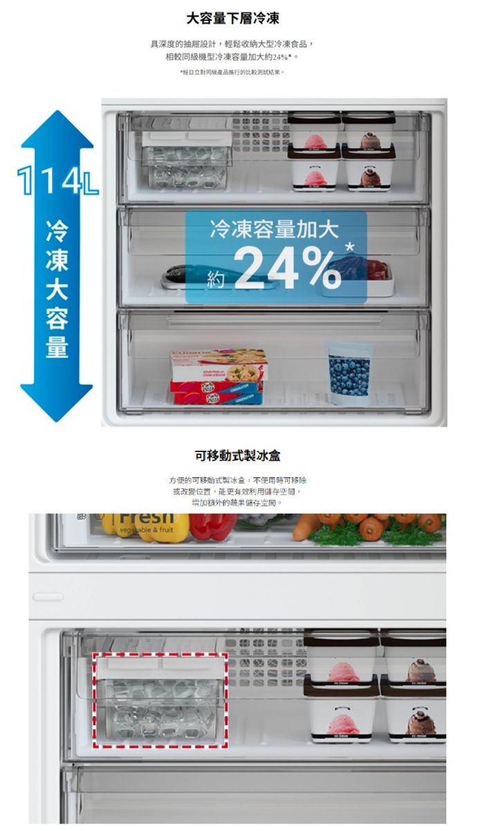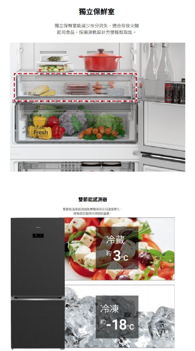 >獨立雙循環冷卻系統 防止空間氣味互相影響 >Max Fresh保鮮技術 蔬果常新鮮 >獨立保鮮室 減少水份流失 >雙節能感測器 保持庫內理想溫度 >大容量下層冷凍 較同級機型冷凍加大約24% >可移動式製冰盒 有效利用儲存空間 >強化玻璃層架 耐重好清潔 >LED螢幕 顯示溫度一目了然