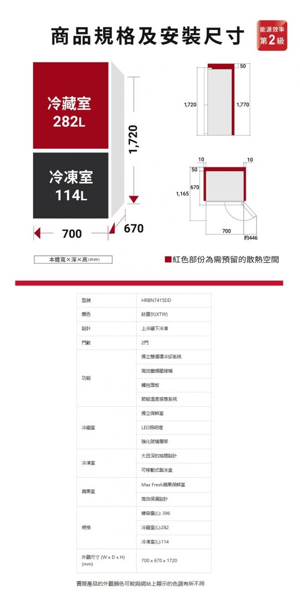 396L 變頻雙門 二級能效 尺寸(寬深高):700X670X1720 mm