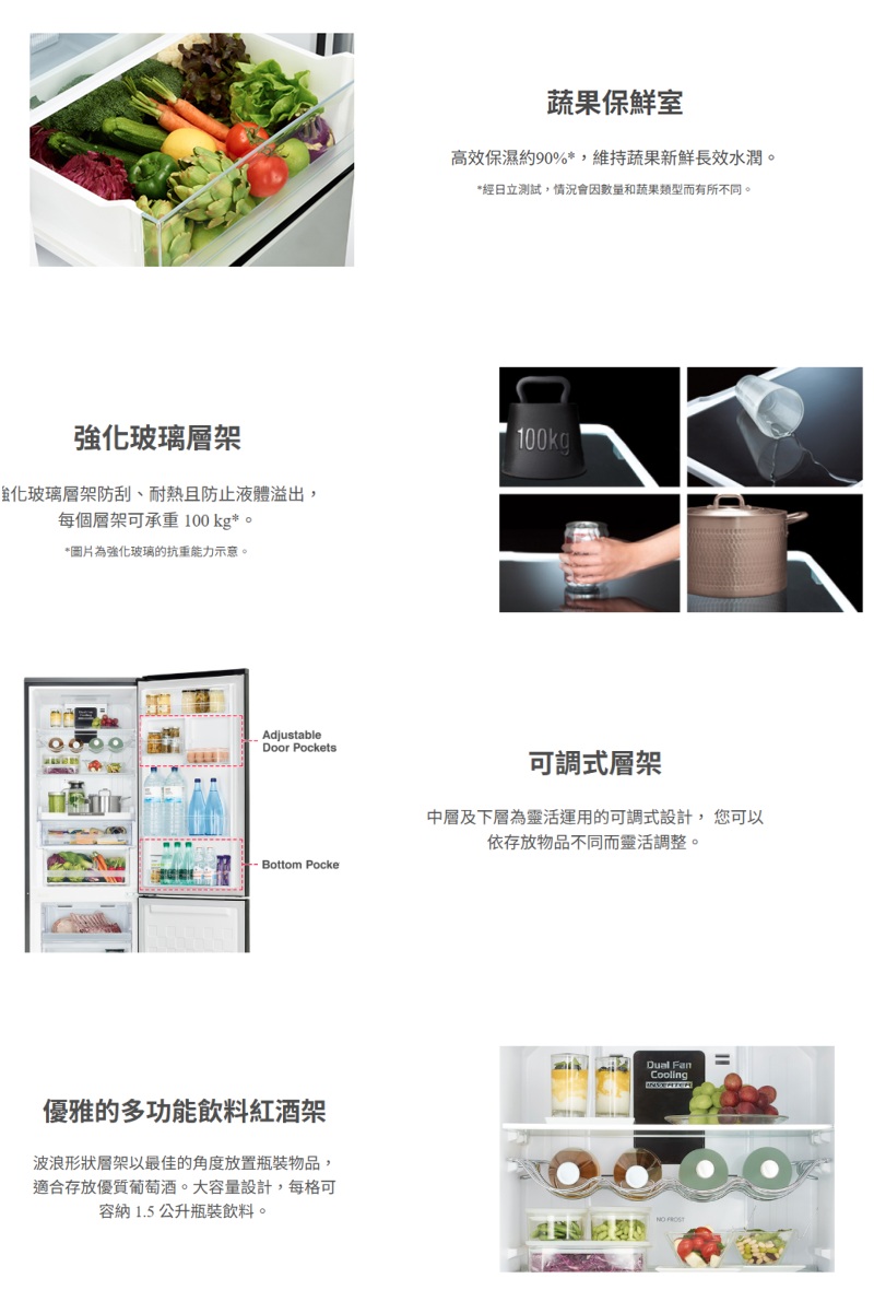 >琉璃觸控面板 質感美型 >急速冷凍鋁盤 快速凍結並抑制冰晶 >保鮮室可切換不同溫度模式 >蔬果保鮮室 高效保濕約90% >強化玻璃層架 耐重好清潔 >可調式門邊層架 >優雅的多功能飲料紅酒架 >大容量且具深度的下層冷凍設計 >左右開門款式可選購(琉璃鏡僅右開)