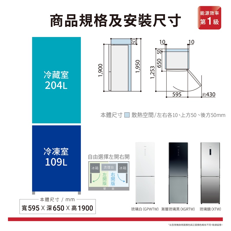 313L 變頻雙門冰箱 一級能效 尺寸(寬深高):595X650X1900 mm