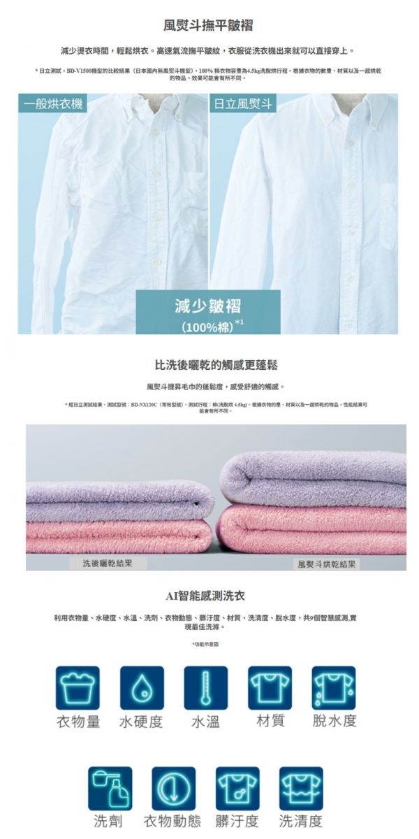 >自主環淨科技 全機自體清潔 >新型線屑濾網加大約70% >自主環淨科技 全機自體清潔 >3D自動全槽洗淨 >自動清潔膠圈 >日立創新科技 風熨斗 >AI智能感測洗衣 >尼加拉飛瀑循環水流 >溫水尼加拉飛瀑洗淨 >洗劑及柔軟劑自動投入 >AIR WASH風速淨 >IoT遠距操控 >國家金級省水標章認證
