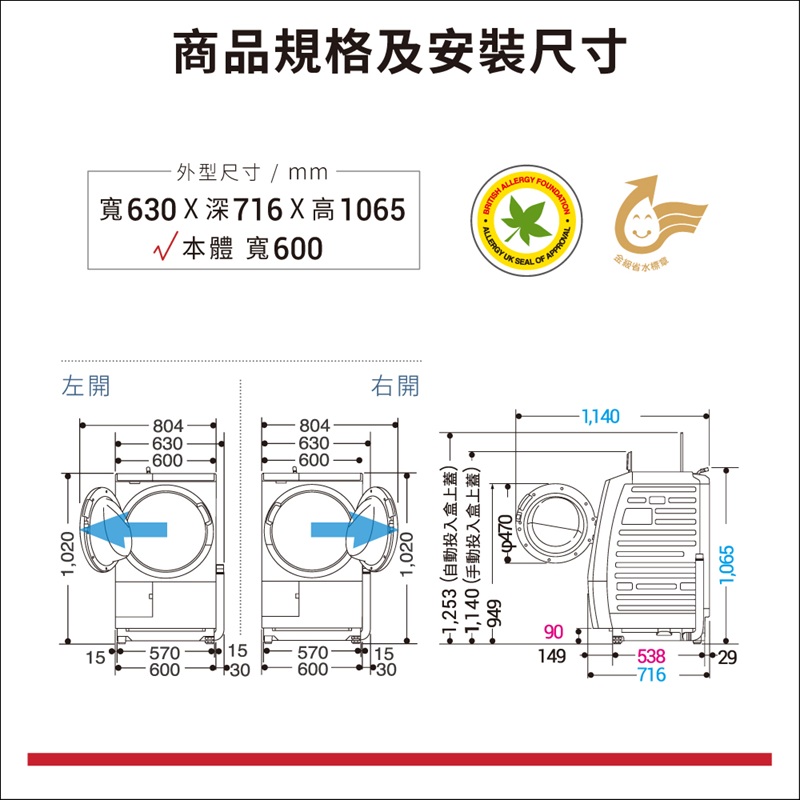 洗:12KG/烘:8KG 本體尺寸(寬X高X深):63cm X 106.5cm X 71.6cm