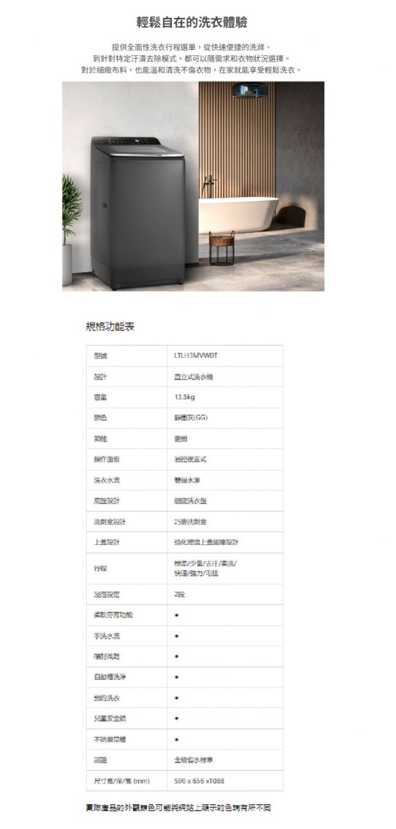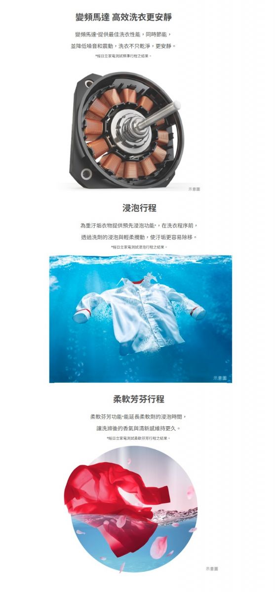 >雙層水瀑搭載迴旋洗衣盤 >手洗水流滿足預洗需求 >噴射風乾減少晒衣時間 >全新節能省水行程 >浸泡及柔軟芳芬功能 >自動清潔內槽 >巧變洗劑盒洗劑輕鬆分配 >易控後置式面板及加大筒槽輕鬆拿取 >強化玻璃上蓋緩降設計 >變頻馬達高效洗衣
