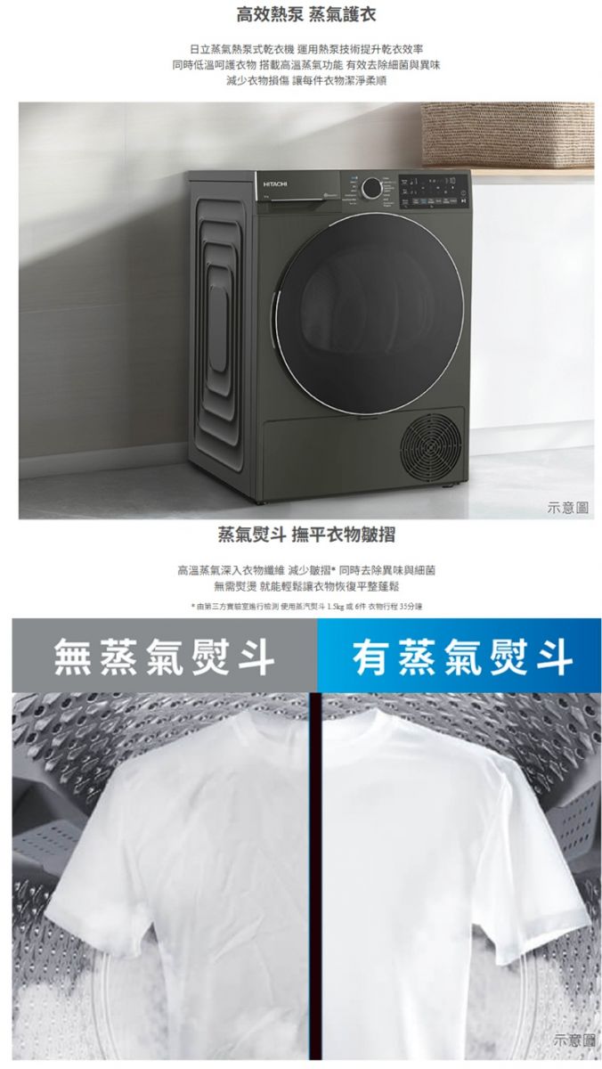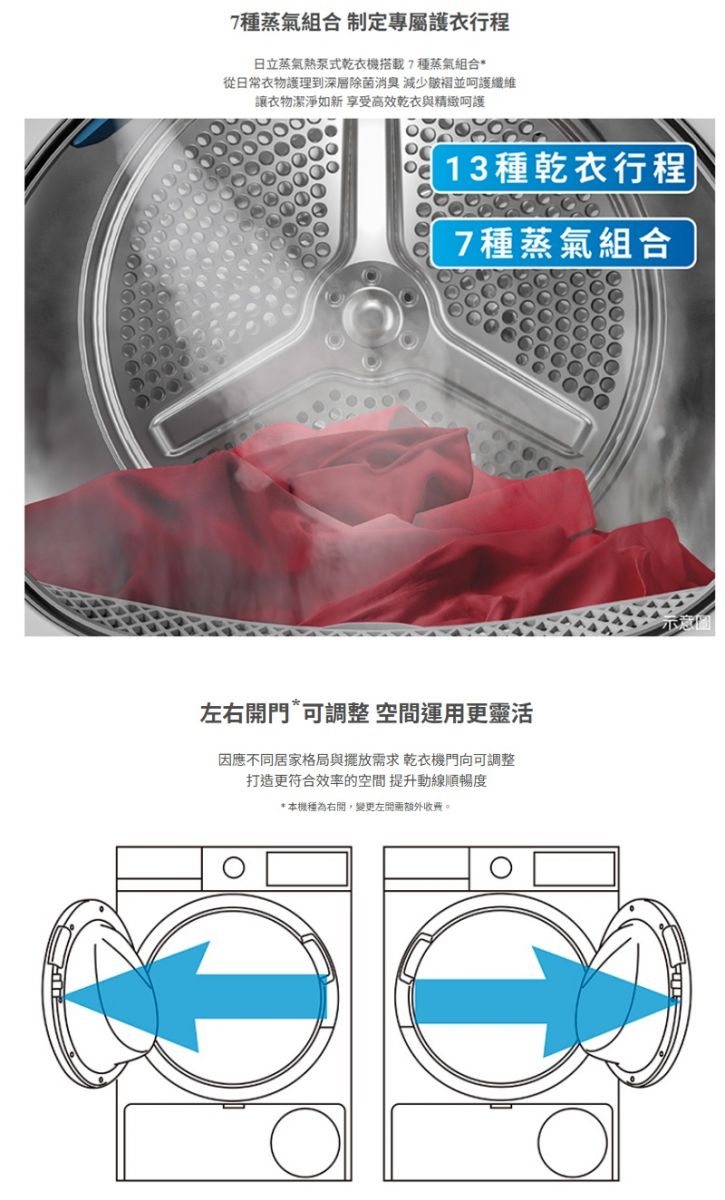 >12kg熱泵式乾衣 >蒸氣熨斗柔順護衣 >風速淨除菌消臭 >雙濕度感測器 精準控溫 >13種乾衣行程/7種蒸氣組合 >左右開門靈活調整