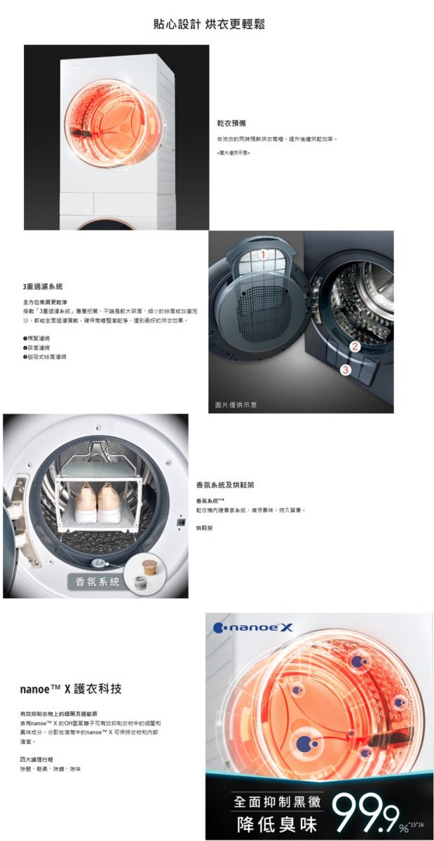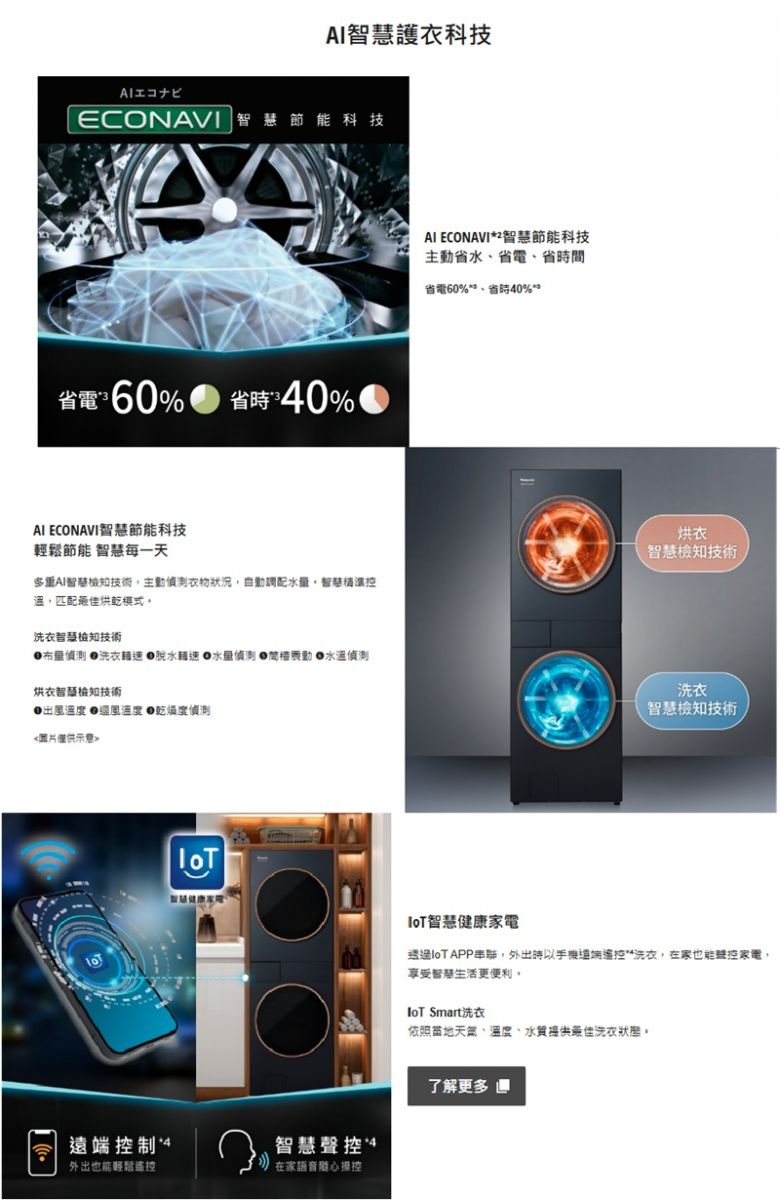 ● 洗衣 15kg、烘衣 15kg ● 搭載新型專利*¹智慧雙控面板 ● Heat Pump熱泵除濕式烘乾 ● nanoe™ X 護衣烘乾行程 ● AI ECONAVI智慧節能科技 ● IoT智慧健康家電 ● 溫水泡洗淨 ● 香氛烘衣 ● 乾衣預備 ● 3重過濾系統 ● 溫水槽洗淨