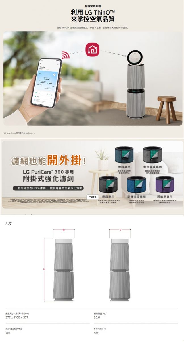 產品尺寸:寬x高x深 (mm):377 x 1100 x 377 建議適用坪數:30坪 產地:韓國