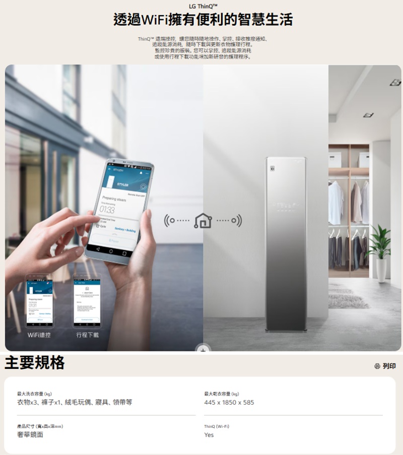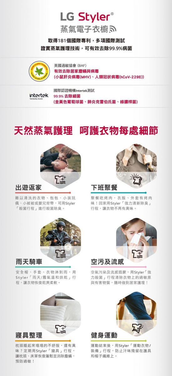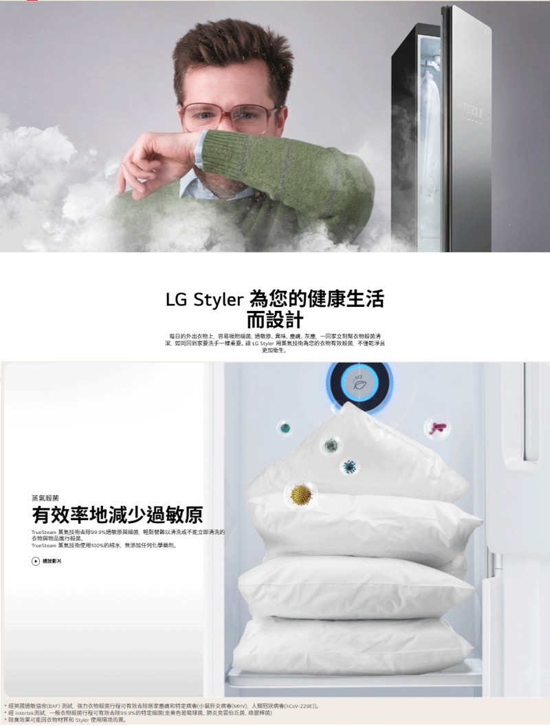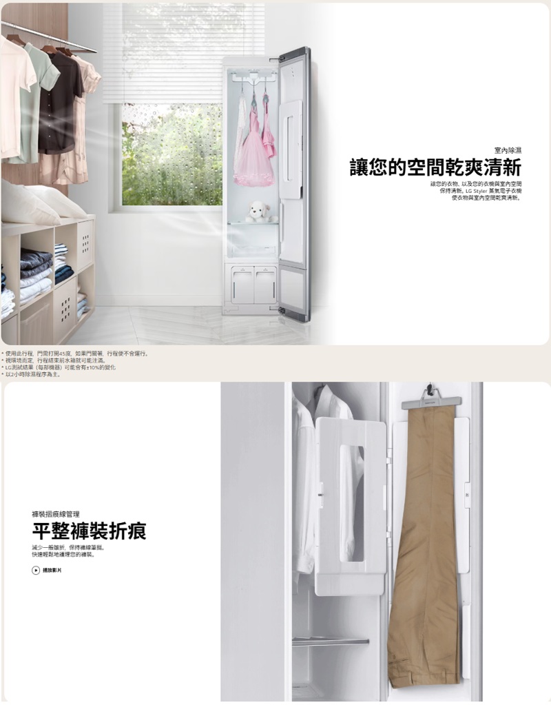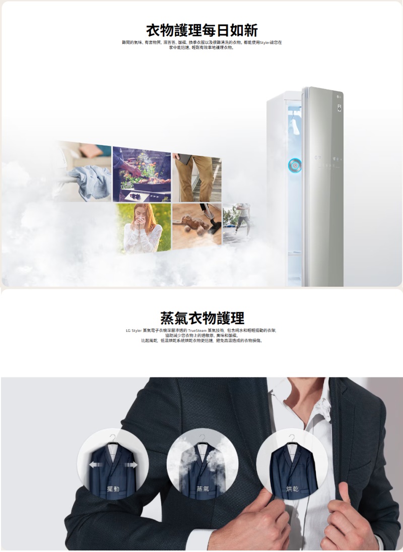 清新除臭,去除衣物難聞異味 天然蒸氣60°殺菌除蟎 99.9% >溫和烘乾,低溫烘乾保護衣料更蓬鬆 >褲線管理,恢復衣物筆挺線條 >室內除濕,11坪室內空間輕鬆除濕 >WiFi遠控,雲端客製衣物護理行程