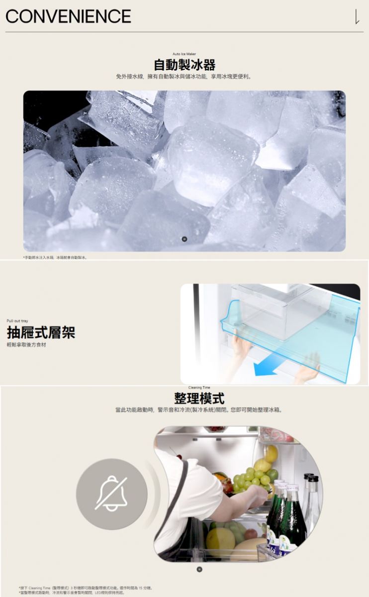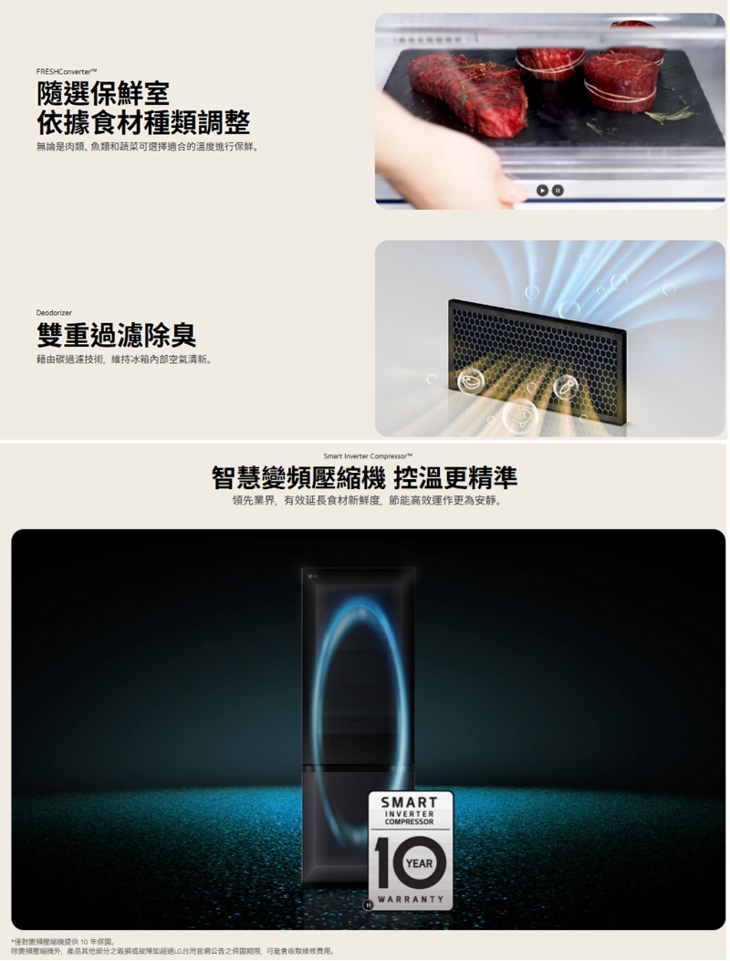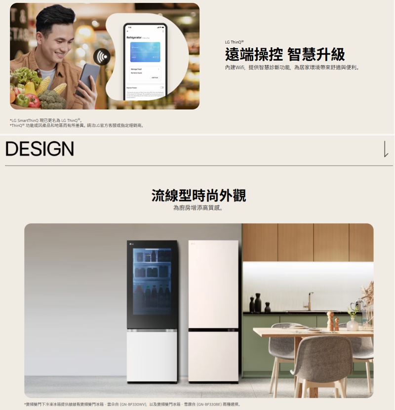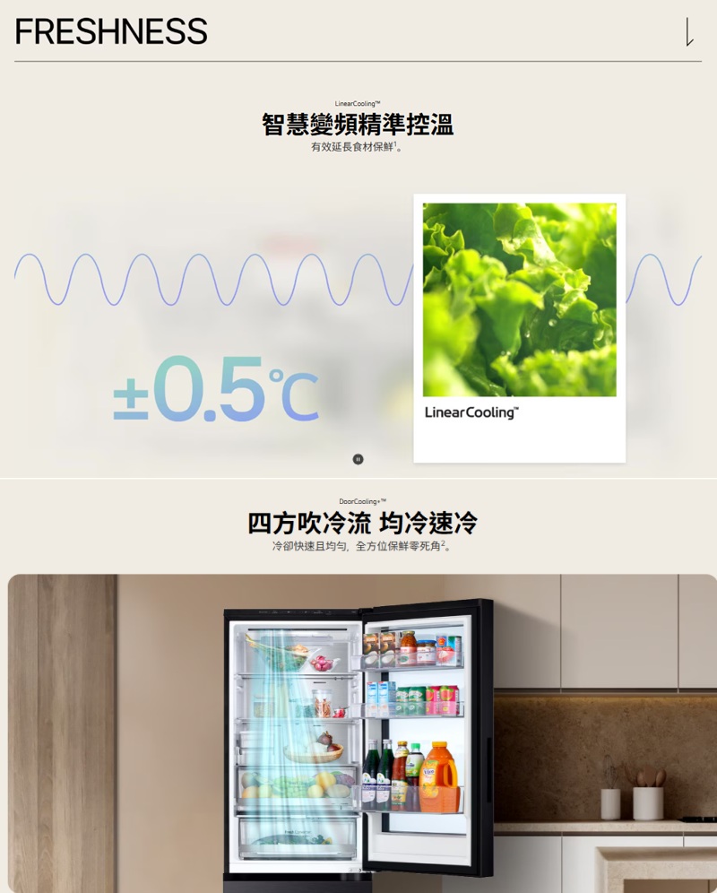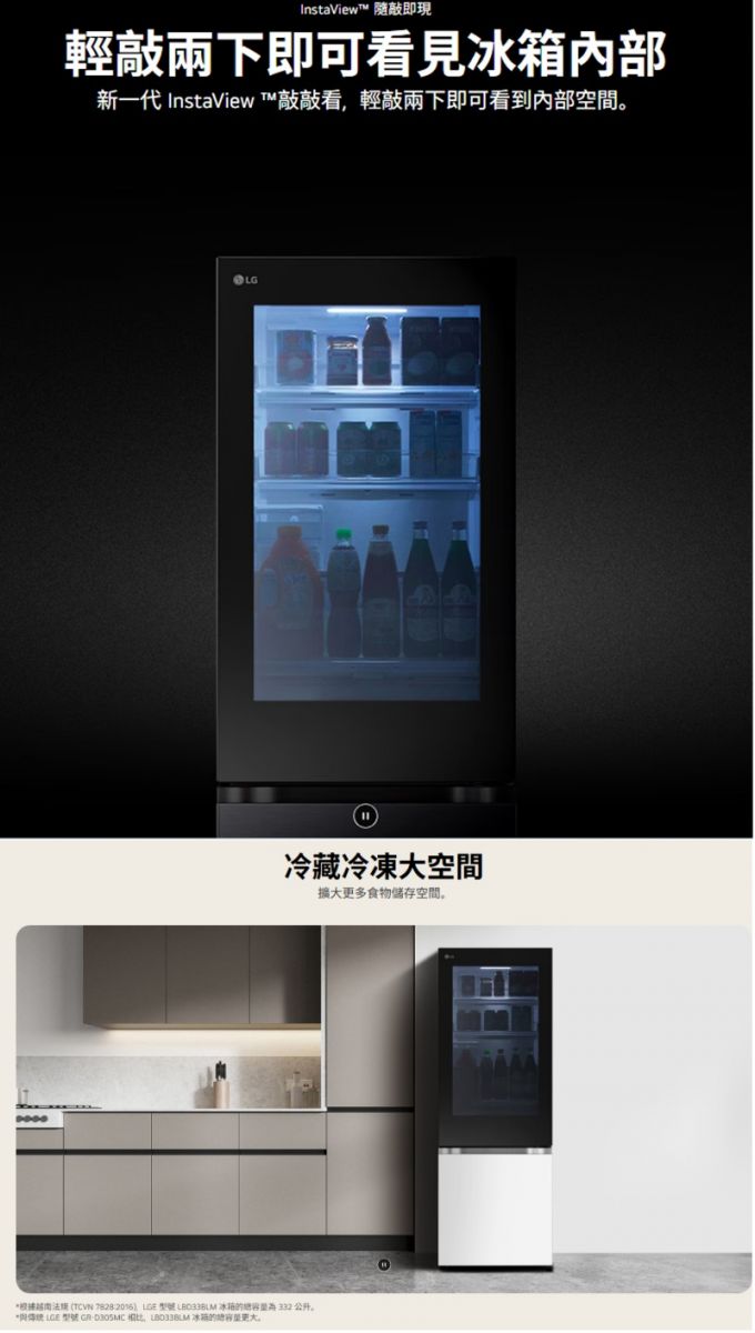 冷凍87/冷藏245公升 InstaView™ 隨敲即現 取物更方便 >FRESHConverter™隨選變溫保鮮室,食材保鮮最佳化 >自動製冰 全天候享用冰塊更便利 >LinearCooling™ 智慧變頻 精準控溫 >DoorCooling™ 四方吹冷流 保鮮零死角
