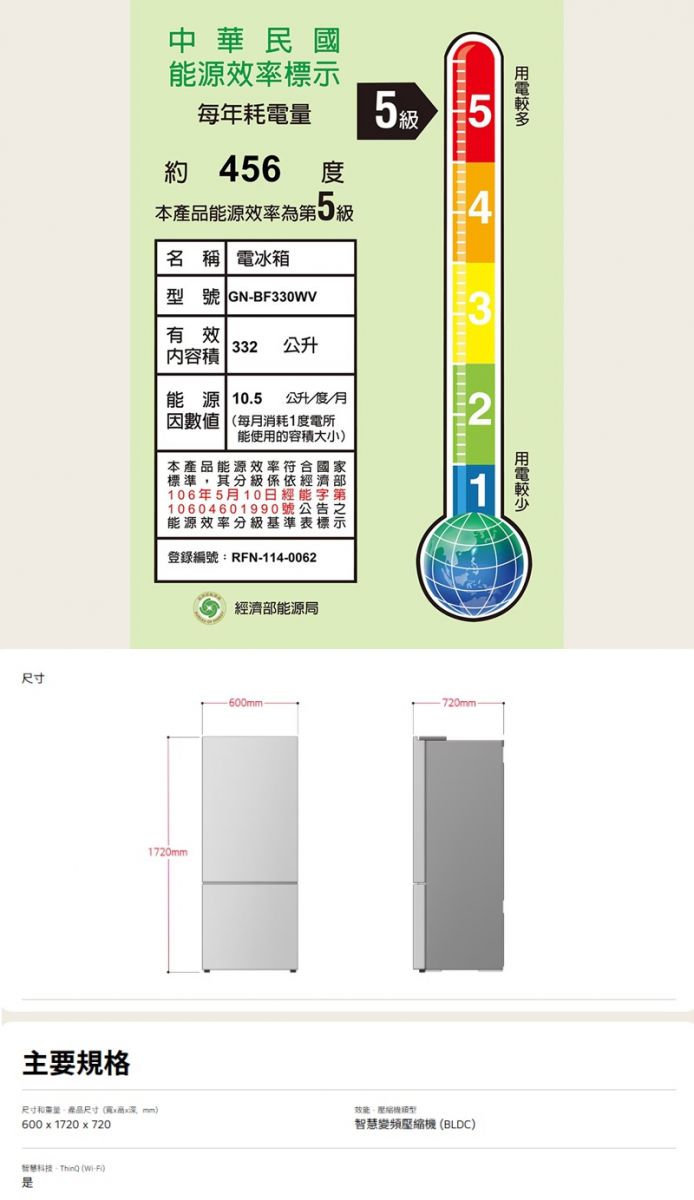 332公升 / 雲朵白 產品尺寸(寬x高x深,mm):600 x 1720 x 720