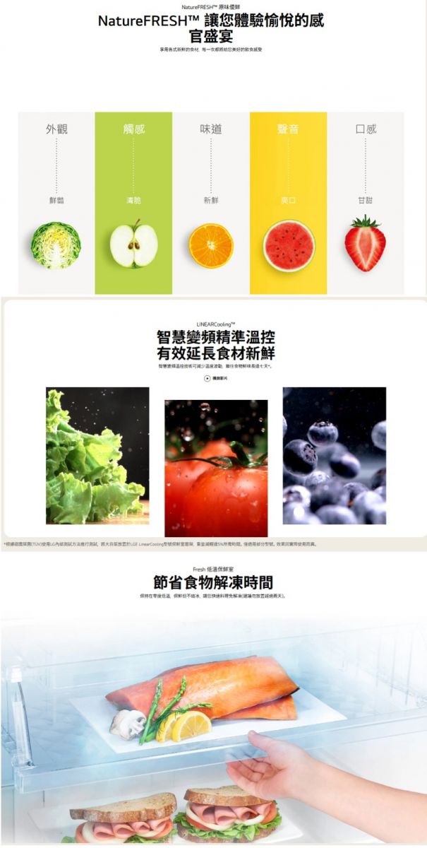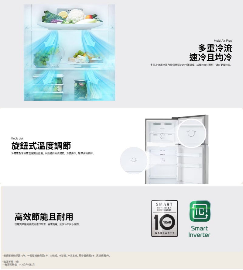 >冷藏208/冷凍58公升 >智慧變頻精準控溫 有效延長食材新鮮度 >Fresh 低溫保鮮室,節省食物解凍時間 >多重冷流 均冷且速冷 >智慧變頻壓縮機 享10年保固