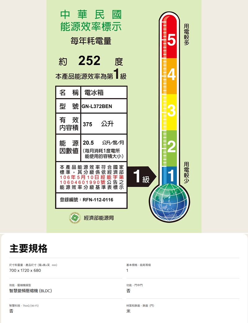 375L / 香草白 產品尺寸(寬x高x深,mm): 700 x 1720 x 680