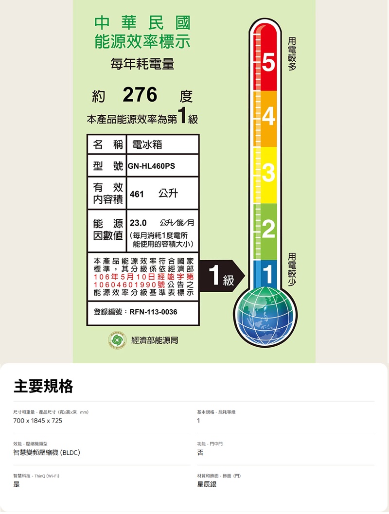>冷藏361/冷凍100公升 >變頻精準溫控 延長7天保鮮 >四方吹冷流⁺™,邊門冷流零死角,維持雞蛋牛奶新鮮 >多重冷流 均冷且速冷 >鮮淨過濾系統,去味除菌 智慧變頻壓縮機 享10年保固